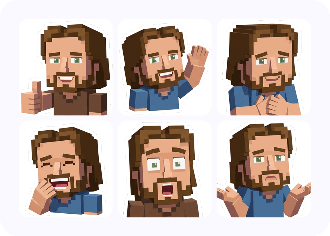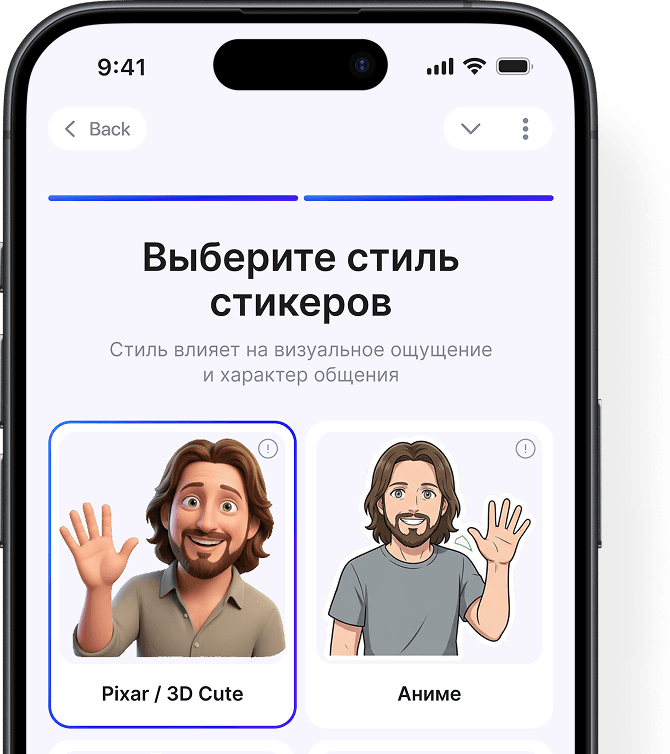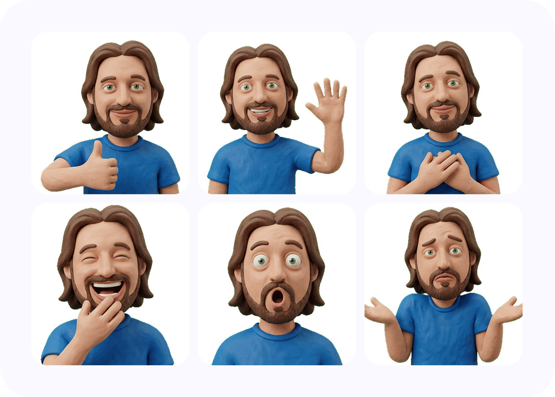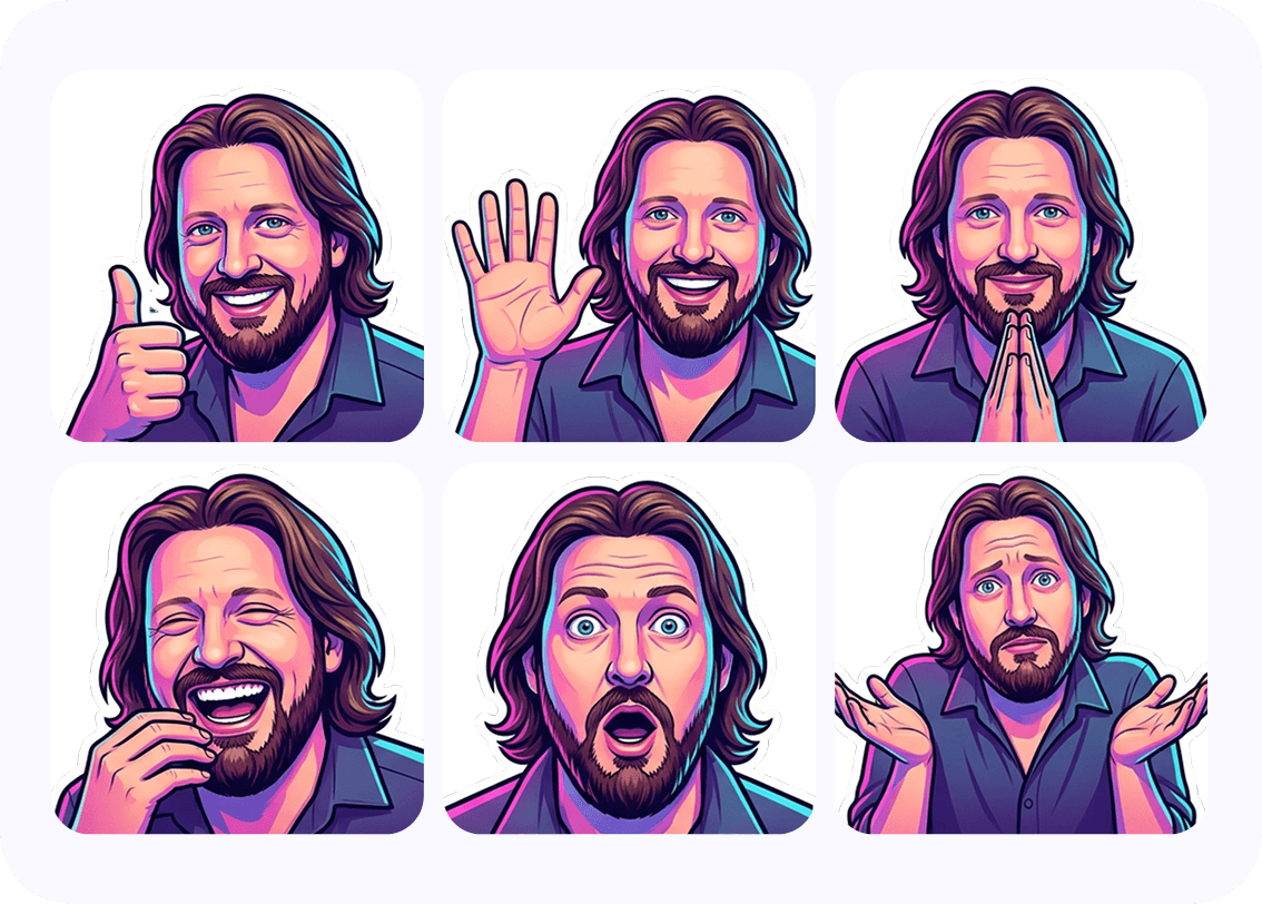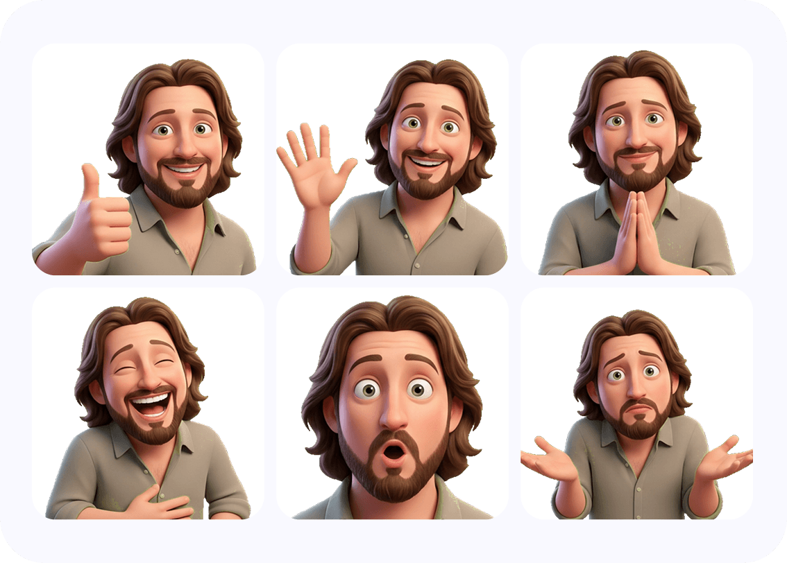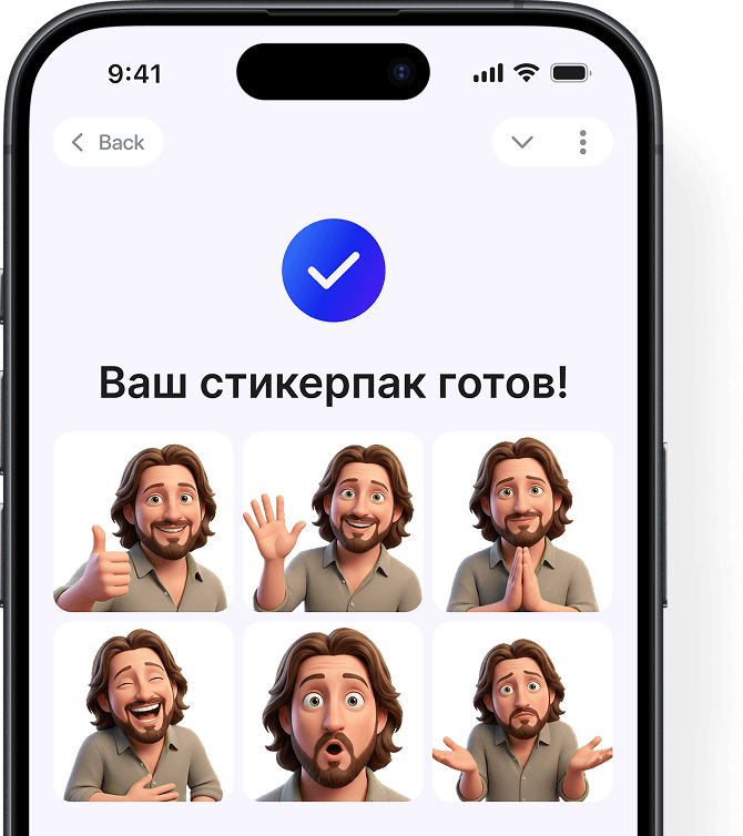 Стикеры создаются на основе вашего фото и сохраняют сходство в эмоциях. Один персонаж — без искажений